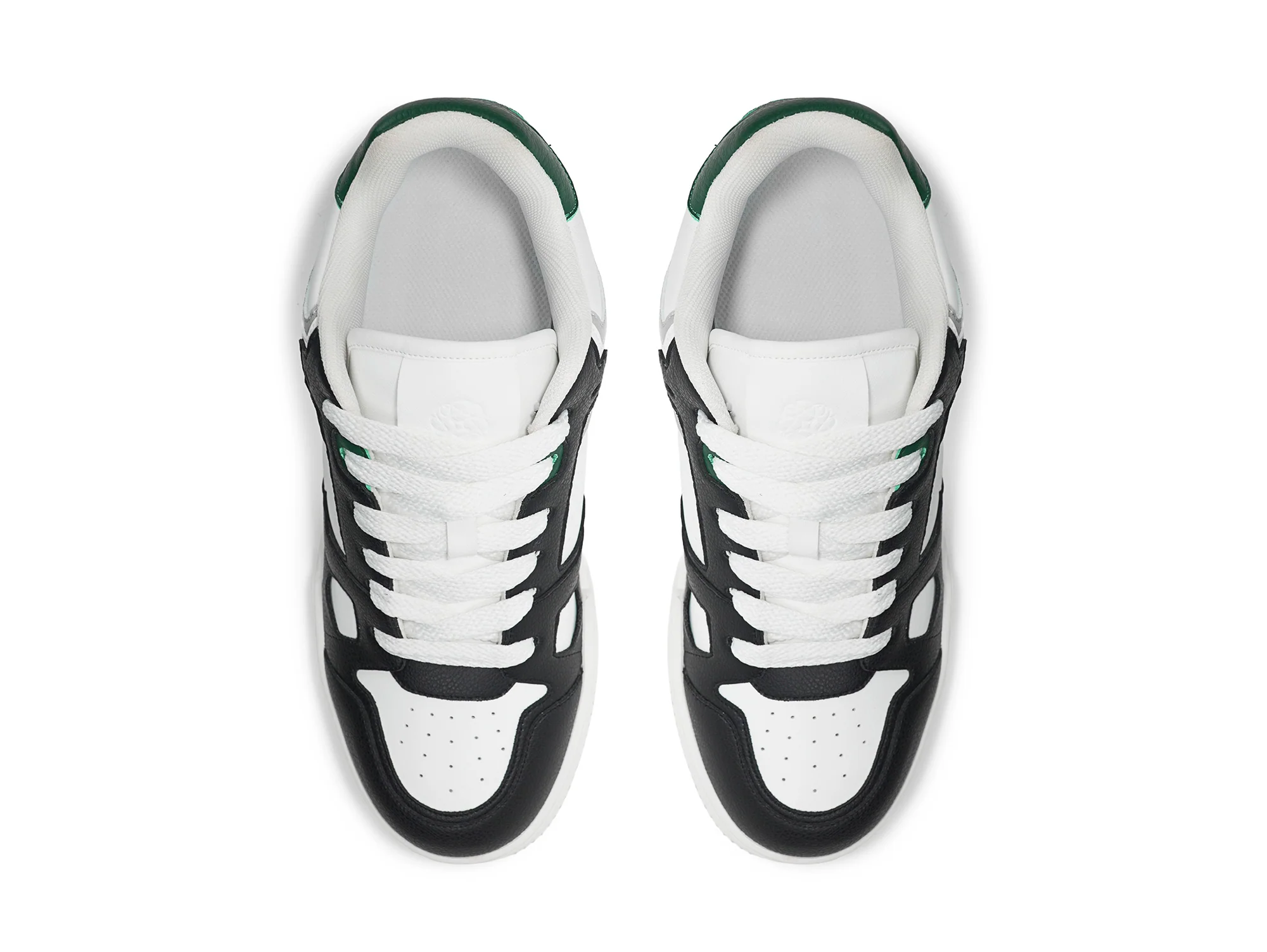 Forza Verto channels vintage skate heritage through a bold black, green, and white palette. This low-cut silhouette is built with layered, multi-textured panels—combining matte white base leather, grained black overlays, and forest green accents at the heel. With clean proportions and everyday versatility, its designed to feel premium, elevated, and effortless. The retro sole and 2.5" built-in height boost deliver a confident stance without sacrificing comfort.