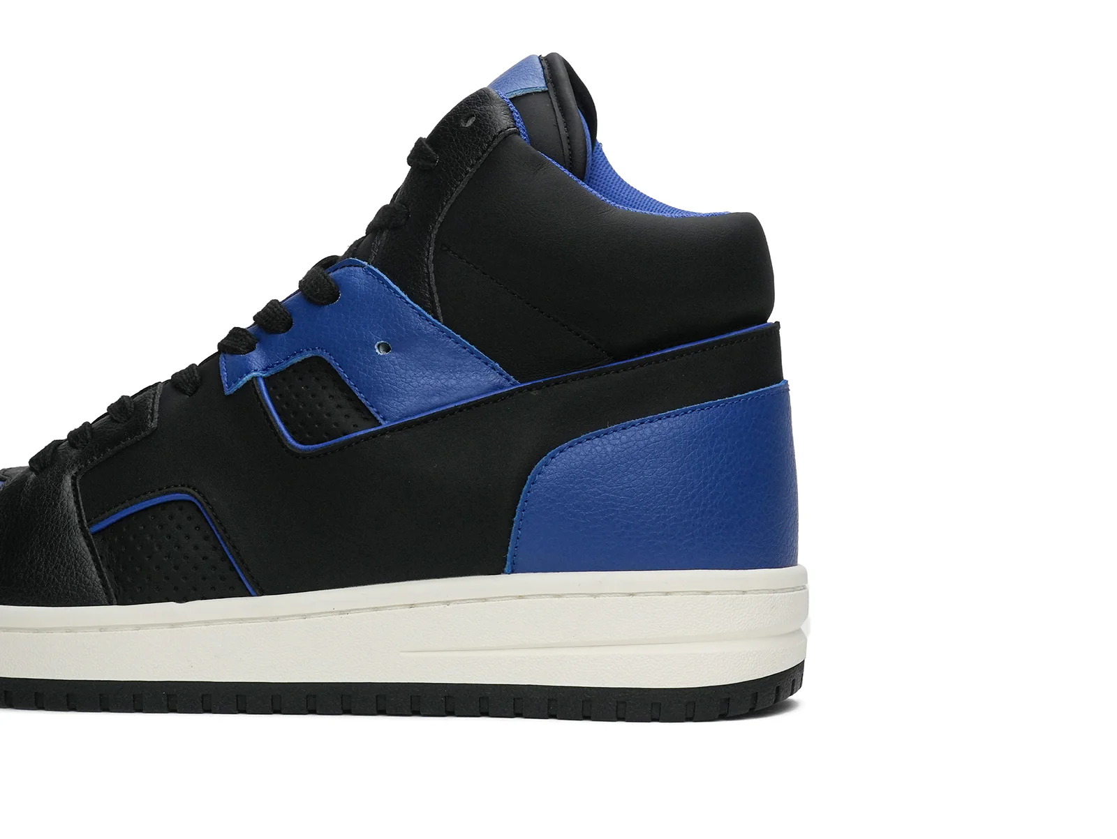 Solar Marine introduces a dynamic edge to the Solar high-top silhouette, grounding electric blue accents against a stealthy black PU leather base. The upper features engineered perforation for breathability and texture, while the re-tooled sole unit delivers modern stability. Designed for a sharp, athletic look, this colorway combines technical depth with everyday wearability, elevated by our invisible height boost for a confident stride.